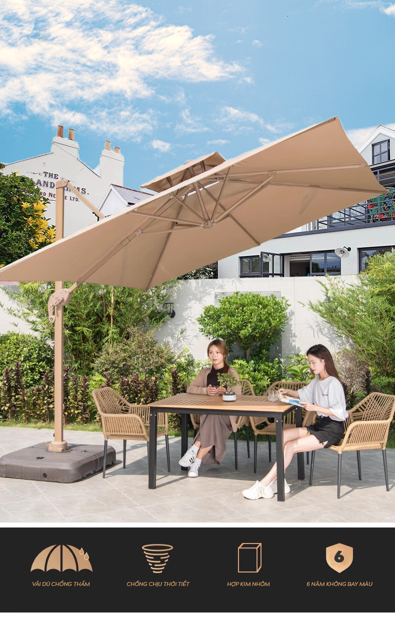 - Dễ dàng di chuyển và lắp đặt: Không cần nhiều công sức để lắp đặt và di chuyển ô dù lệch tâm vuông, giúp bạn tiết kiệm thời gian và công sức.