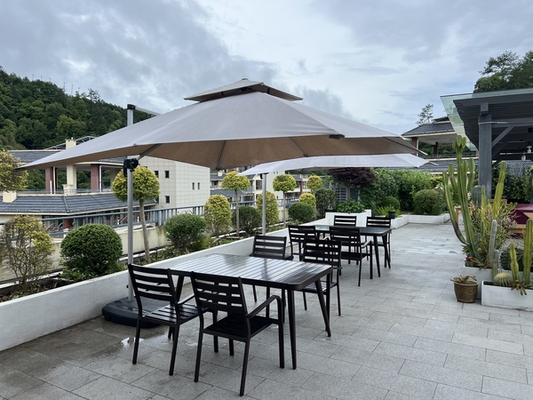 Nhiều quán cafe sân vườn lựa chọn dù lệch tâm tròn hoặc vuông kích thước 3m, vừa đủ che phủ 1–2 bộ bàn ghế. Khi kết hợp cùng bàn ghế nhôm đúc, bàn ghế composit hoặc bàn ghế dây dù, tổng thể không gian trở nên hài hòa, sang trọng và rất “chill”.